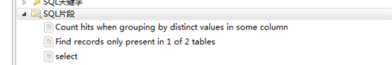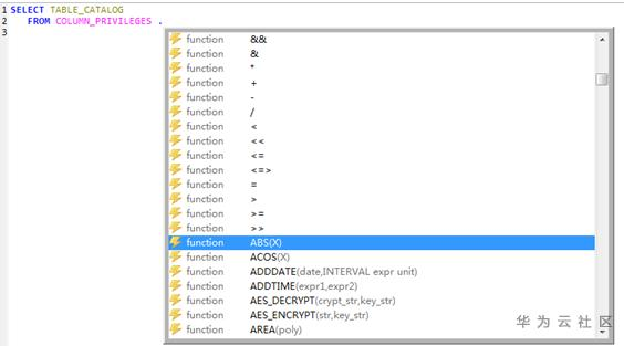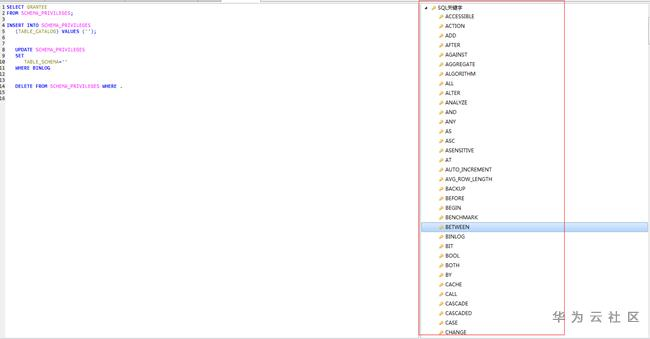 1. 自动补全只提示database、table、function,关键字直接全部罗列在右侧panel中,可以随时查看所有SQL关键字,双击某个关键字,该关键字就会自动出现在编辑器的光标处。