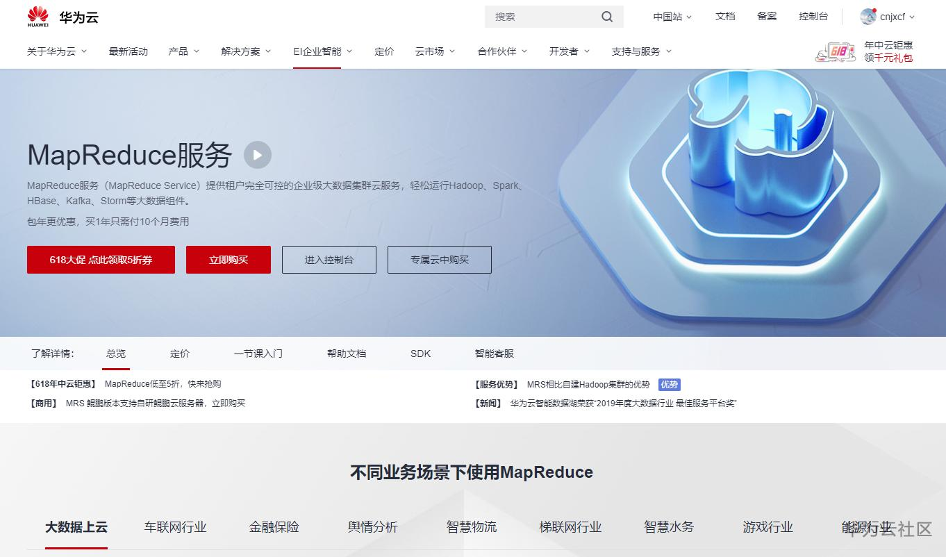 1、 华为云官网选择产品—EI企业智能— MapReduce服务,或直接搜索“MapReduce服务”,进入到MapReduce服务的产品页面,点击“立即购买”按钮即可直接跳转到集群的快速购买页面;