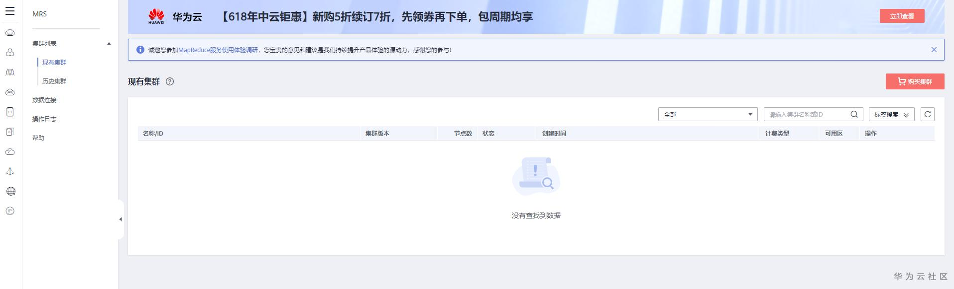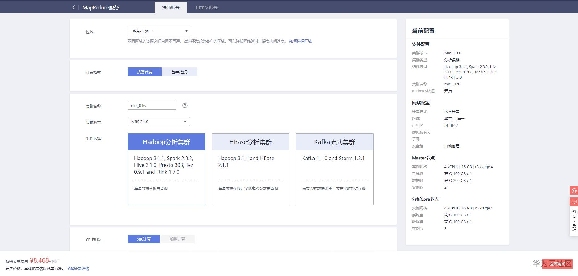 2、 华为云官网在右上角点击进入“控制台”,点击左侧的服务列表,选择EI企业智能—MapReduce服务,进入到MRS的控制台页面,点击右侧“购买集群”进入到集群的快速购买页面