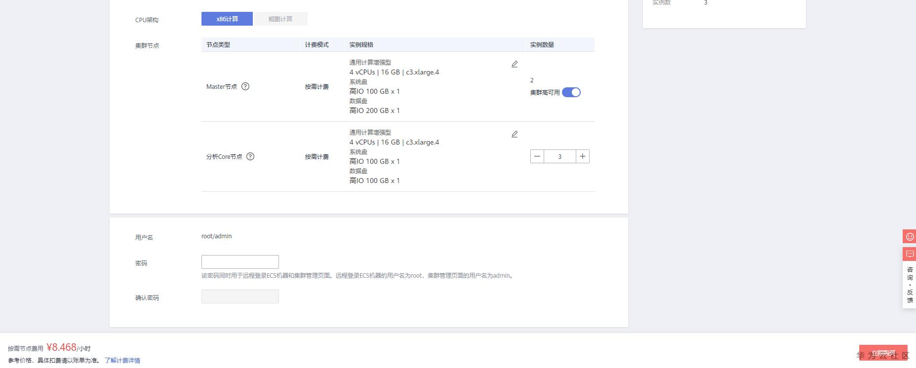 集群节点:请根据自身需要选择集群节点规格数量等。