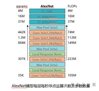 说起AI业务,就不得不提最经典的AlexNet,AlexNet模型于2012年提出,其被认为是计算机视觉领域最有影响力的模型之一。AlexNet网络主要包含八层,前五层是卷积层,最后三层是全连接层。 配合pooling及norm运算,以下列出所有卷积层和全连接层的参数规模以及每层的浮点计算量,从图中可以看出AlexNet网络的参数规模达到了6千万量级,计算量达到720MFlops。通过在横向比较几个经典的分类网络,参数规模以及计算量都是巨大的。那么从计算量的角度来看计算中99%以上都是卷积运算,本质都是矩阵运算。