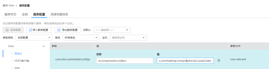 修改Hive服务端参数,添加自定义参数“io.compression.codecs”,值为“com.hadoop.compression.lzo.LzoCodec,com.hadoop.compression.lzo.LzopCodec”