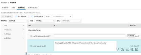 修改Hive服务端参数,“hive.user.aux.jars.path”值增加“file:///opt/Bigdata/MRS_1.9.x/install/FusionInsight-Hive-2.3.3/hive/auxlib/”。注意这里的路径就是上面给MR引擎拷贝的包路径。