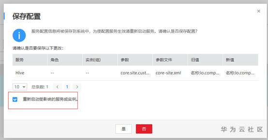 重启Hive和HDFS相关服务。注意选上“重新启动受影响的服务或实例”。