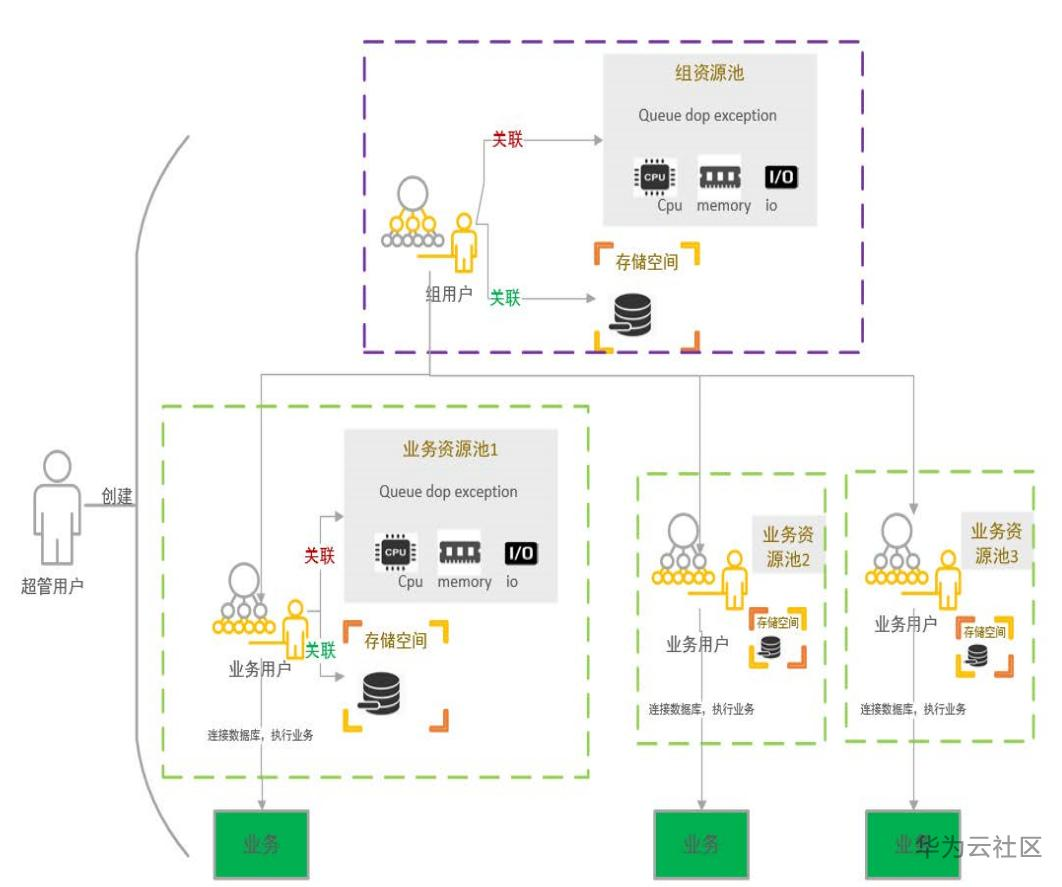 GaussDB采用两层用户的架构来组织租户(新版本中可能修改为单层架构)。一个组用户下可以有 多个业务用户,但一个业务用户只 能属于一个组用户;不同的租户(数据库用户)关联不 同的资源池, 每个资源池通过 CGroup控制CPU资源,通过逻辑内 存管理机制控制内存使用;资源池分配以百分比的形式提供用 户计算资源的隔离,数据库集群部 署环境对用户透明;创建用户时,指定用户持久化存储 空间大小,结合用户权限,提供用 户存储资源的隔离。存储空间大小 可在组用户级别指定,统筹所有业 务用户的存储空间。