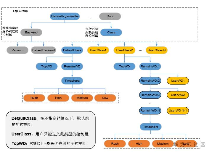 图中是控制组的一个挂载树,从最上层开始,就分为了两部分,一部分是属于Gaussdb的资源,一部分是留给系统其他进程使用的资源,我们使用的资源如图所示,都是挂载到Gaussdb:gaussdba的,其中第一层又分为两个控制组,Backend用来预留资源给数据库常驻的各个工作线程,Class控制组的资源用来分配给各个用户进行作业执行。