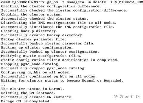 gs_om -t managecn -m delete -X ${BIGDATA_HOME}/FusionInsight_MPPDB_6.5.1/*_*_MPPDBServer/etc/mppdb-install-config.xml