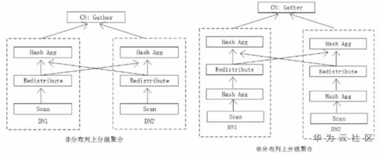 从以上的计划中,可以看到在DN上先做了hashagg,再又重分发给其他DN,再次做hashagg,如下图中的右侧。为什么不是先把数据重分布发给其他DN后,做一次hashagg即可,如下图的左侧
