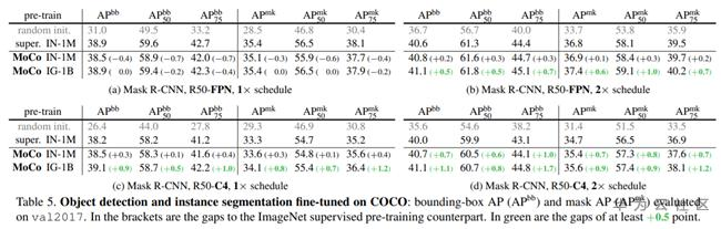 MoCo在Instagram 1 Billion 数据上预训练后在下游7个任务超过Imagenet有监督模型。