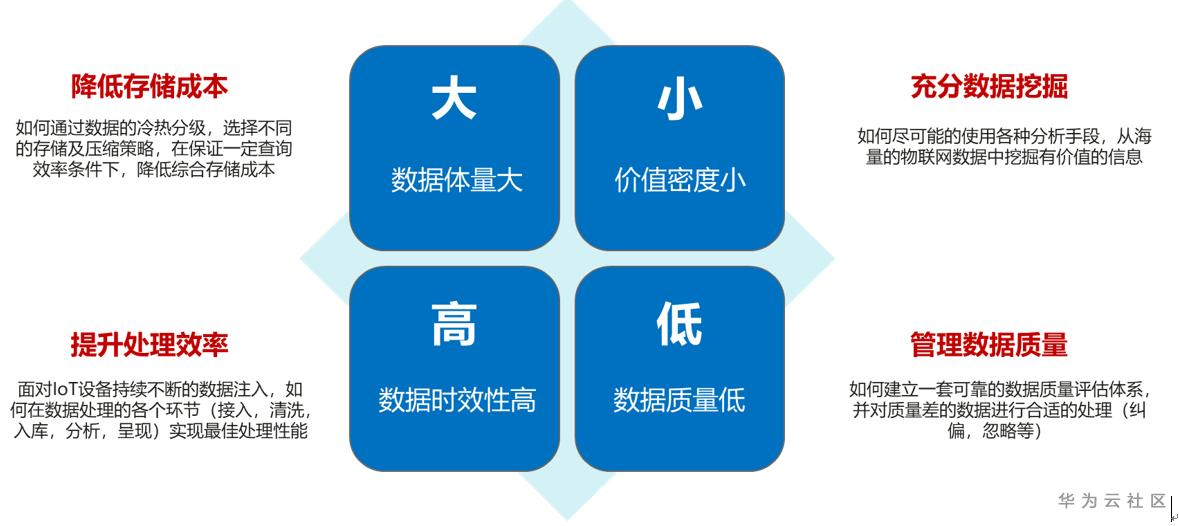 我把物联网数据的特点和挑战归纳如下。我觉得最主要的4个特点是“大”,“小”,“高”,“低”。