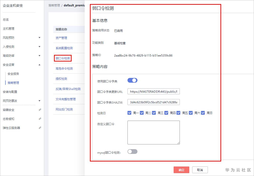 步骤 2 进入“策略管理”页面,配置指定策略组的“弱口令检测”,添加自定义弱口令。