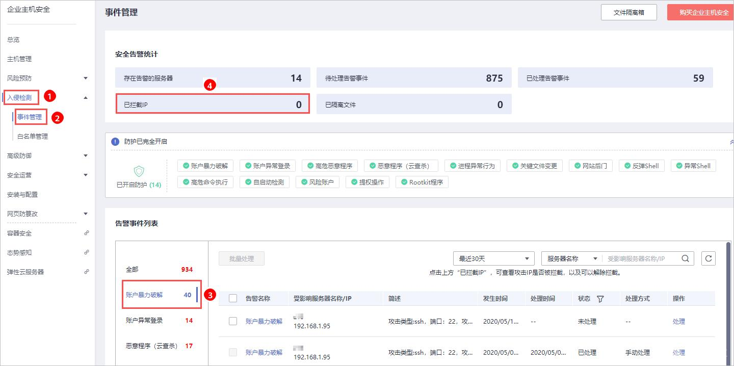 步骤 1 进入“账户暴力破解”页面,可查看已防护的服务器上的暴力破解拦截记录。