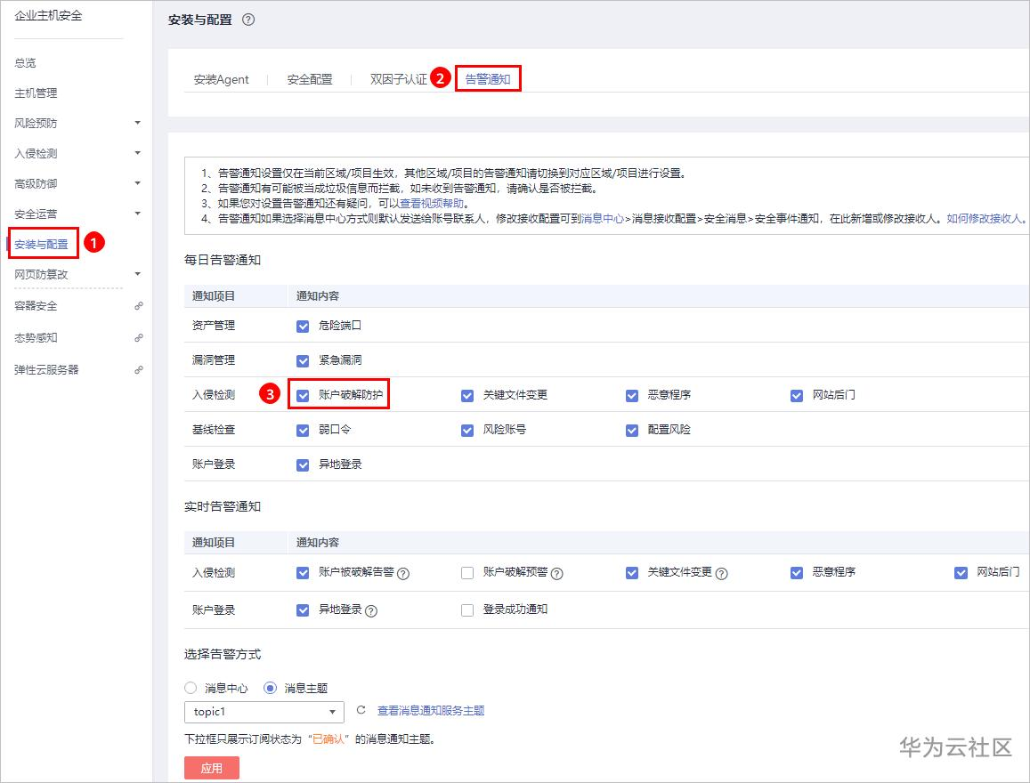 步骤 2 进入“告警通知”页面,勾选“账户破解防护”,一旦检测出账户暴力破解,您将会收到告警通知。