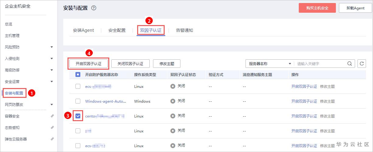 在“双因子认证”页面,勾选需要开启双因子的主机,单击“开启双因子认证”,开启双因子认证。