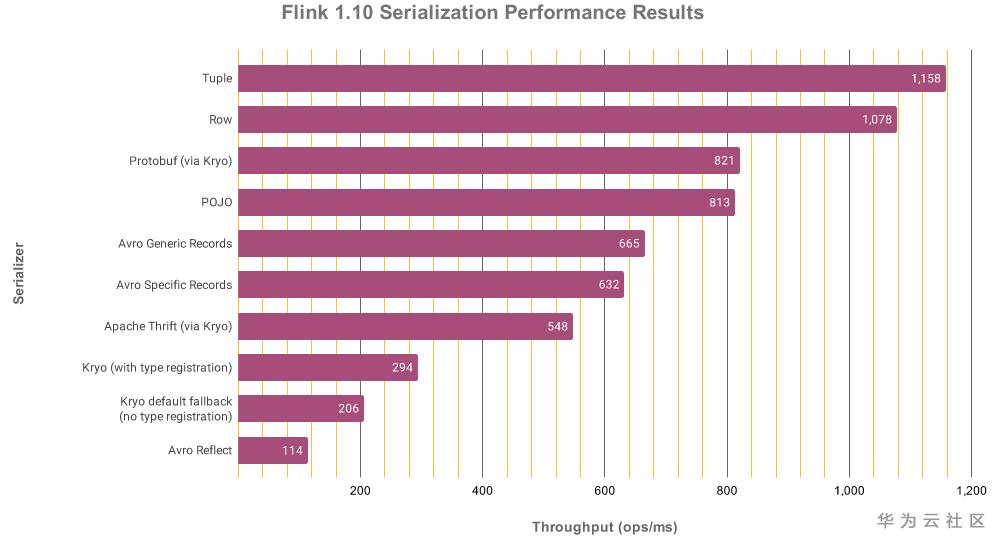 flink支持java、scala基本数据类型,以及java Tuples、scala Case Class、Flink Value,对于这些数据类型,flink会采用自身的序列化反序列化器去做序列化操作,对于其他数据类型,flink会采用kyro方式序列化,kyro序列化方式效率会比flink自带的方式低很多,根据flink doc提供的数据,各种不同类型序列化效率如图