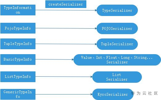 flink对数据进行处理时,如涉及到网络传输,读写状态,checkoutponit,savepoint等都会涉及到序列化反序列化操作。对于flink支持的数据类型,flink会为其生成特定的序列化器,反序列化器以及比较器。对于flink无法识别的类型会被当做泛型嫁给kryo进行序列化,如上图所示,kyro的序列化方式效率较低。针对各种类型,flink会选取如下序列化器。