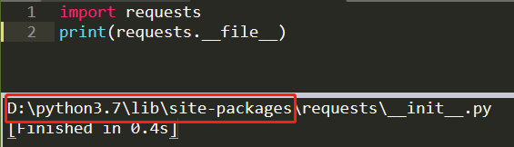 第一步:首先找到当前编辑器(可能会存在多个python解析器)对应的第三方库的安装路径,如果不知道具体的位置,可以在使用的编辑器窗口输入如下代码,这里以requests库为例,查看一下第三方库的文件位置,红色标记的即是