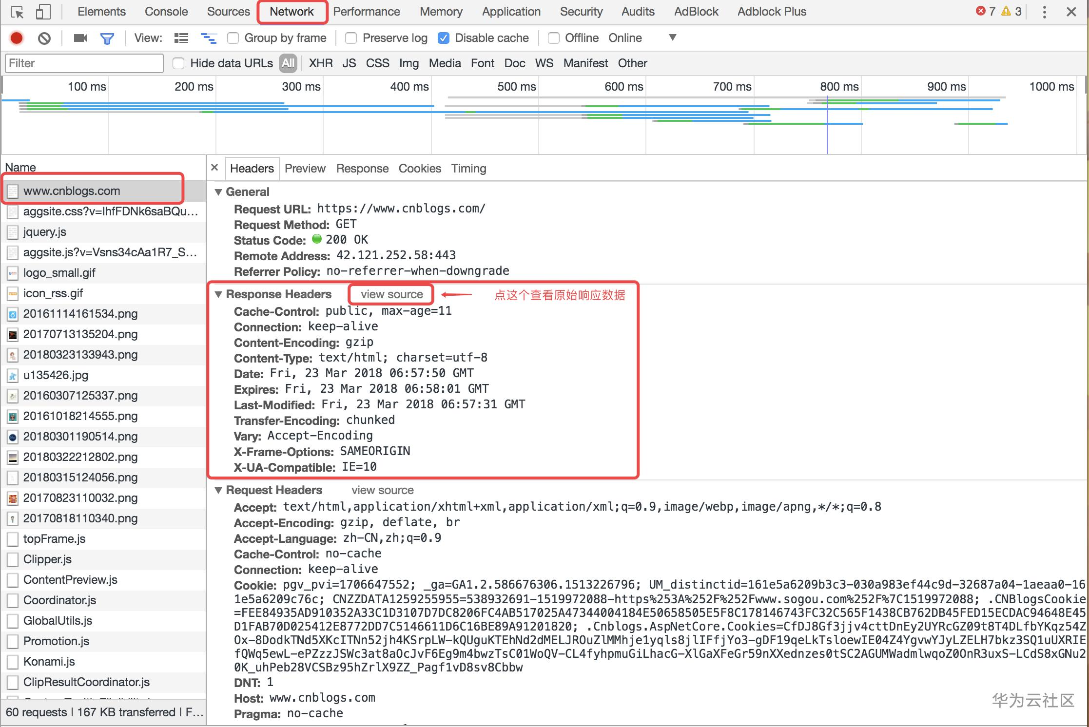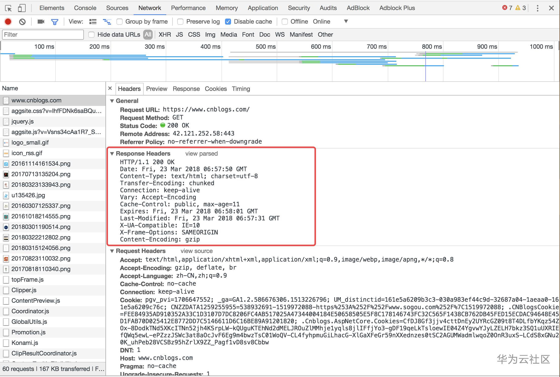 然后我们再看一下我们访问博客园官网时浏览器收到的响应信息是什么。