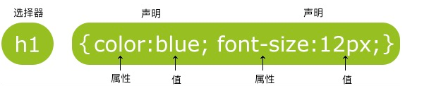 选择器是你需要改变样式的 HTML 元素标签。CSS声明总是以分号(;)结束,声明总以大括号({})括起来,声明是你要改的样式,每条声明由一个属性和一个值组成。属性(property)是您希望设置的样式属性(style attribute),每个属性有一个值。属性和值被冒号分开。