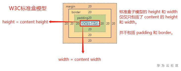 W3C标准盒模型的范围(组成)包括了margin、border、padding、content;但是,content部分并不包括其他组成部分。如下demo: