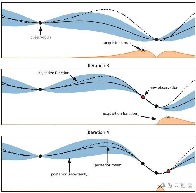 前面两种搜索算法通常搜索效率较低,而Bayesian 优化则是近些年新出现(也不算新其实,大约从2012年开始)的一个HPO算法[5]。其基本思想是将HPO的过程用一个高斯过程(Gaussian processes)来模拟,然后通过采集函数来寻找下一个最优的评估点,评估完成后,再用其来修正代理模型,如下图所示。这里采集函数的目的是平衡exploration(探索)与exploitation(利用),来加快超参的搜索过程。