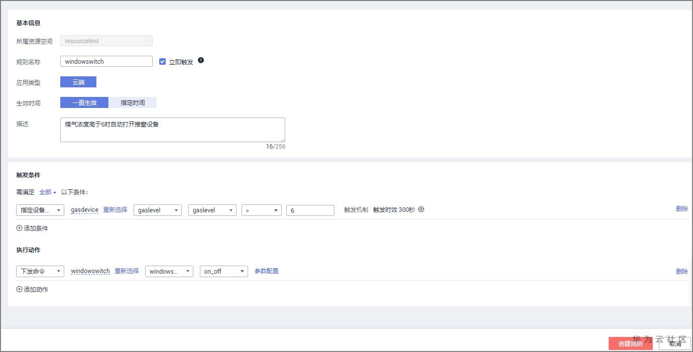 按规则设备联动:IoTDA平台会根据煤气检测器上报的属性值,进行规则过滤,把属性值转成命令下发给无线推窗器设备。