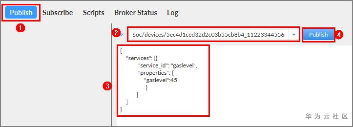 { "services": [{ "service_id": "gaslevel", "properties": { "gaslevel": 45 } } ] }点击“Publish”按钮上报属性值。