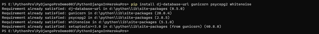 3、使用cmd命令安装gunicorn、 psycopg2 、whitenoise