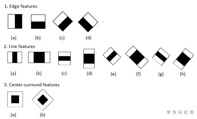 大致知道OpenCV的作用后,来看下Haar特征+Adaboost级联分类器,Haar特征算子就是下图的所有黑色矩阵的像素值减去所有白色矩阵像素值的和。