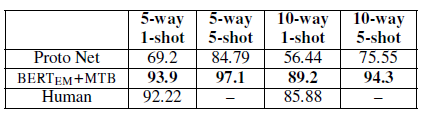 [1] Han et al. 2018 FewRel: A Large-Scale Supervised Few-Shot Relation Classification Dataset with State-of-the-Art Evaluation.