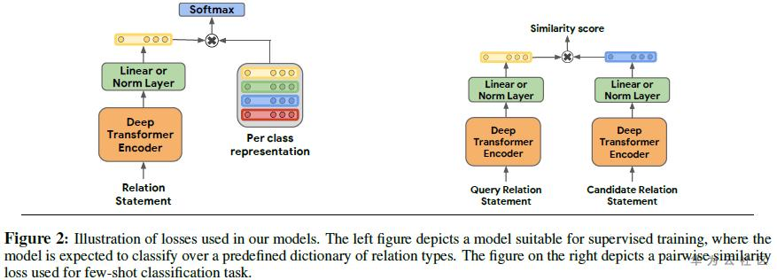 Matching the Blanks模型在Few-shot任务中,修改了模型训练的损失计算方式。如图二,左右两个框架是有监督和无监督关系分类模型的对比。有监督模型最后计算的损失为关系表示softmax的预测关系类别和样本真正关系类别的交叉熵损失。对于few-shot任务,我们使用查询语句的关系表示和每个候选语句之间的点积作为相似度得分,并用softmax(相似度得分)和样本真正关系类别的交叉熵损失作为训练损失。