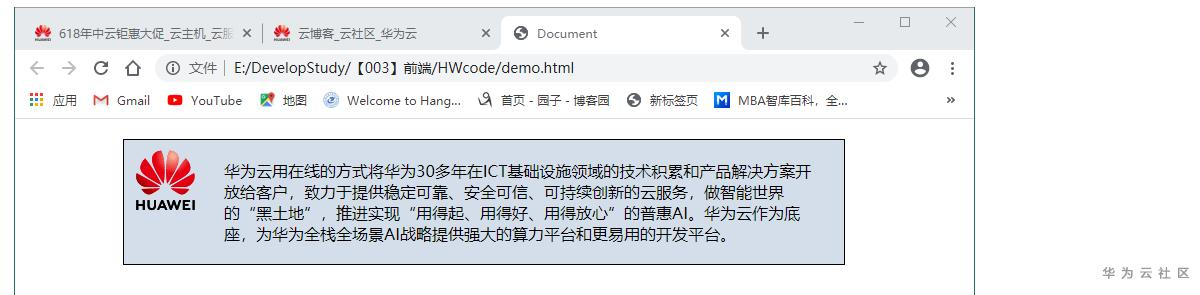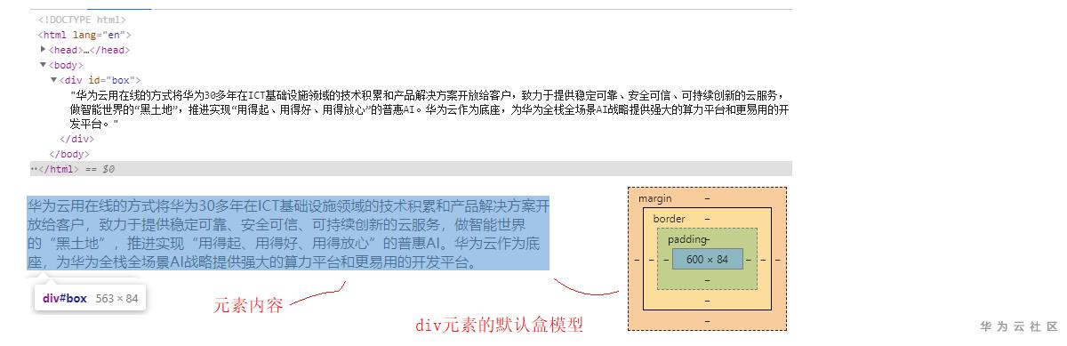 如下所示是一个div元素,<div>标签中包含一段文字,把div元素看做一个盒子的话,里面的文字就是div盒子的元素内容,div默认没有内边距,边框和外边距。此时盒子的大小刚好能包含所有的内容,内容与盒子边缘没有空隙。