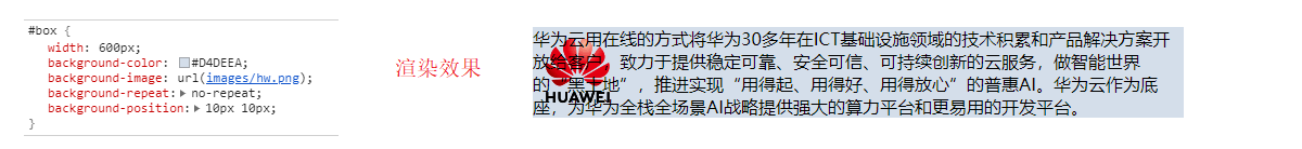 接下来可以利用background属性为元素设置一个背景色和背景图片,使div元素的内容更加醒目,如下,我们发现文字覆盖在背景图片上,显得很混乱