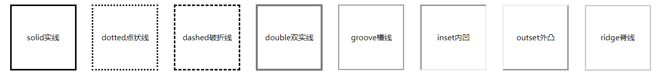 border-style属性可以控制边框的视觉样式,有多种样式可选,如solid、dotted、dashed、double、groove、inset、outset,ridge默认值是none,表示无边框。如下图所示