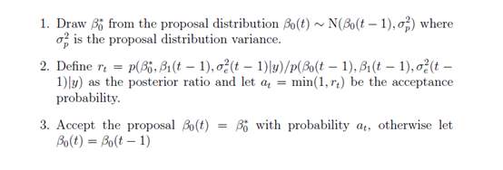 If the conditional distributions do not have the simple form, then Metropolis Hastings sampling will be considered. In general MCMC methods generate new values from a proposal distribution that determines how to choose a new parameter value given the current one. The proposal distribution suggests a new value for the parameter of interest. This new value is then either accepted as the new estimate for the next iteration or rejected and the current value is used as the new estimate for the next iteration.