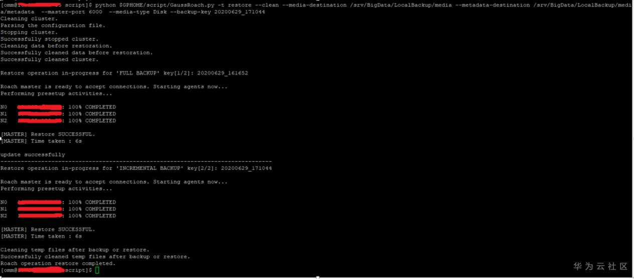 进入“$GPHOME/script”目录,(在主代理主机)执行集群恢复操作, 并在恢复之前清理集群。(注:虽然我指定的是最近一次的backup-key,实际恢复的时候是先恢复全量,然后,逐步恢复每个增量)