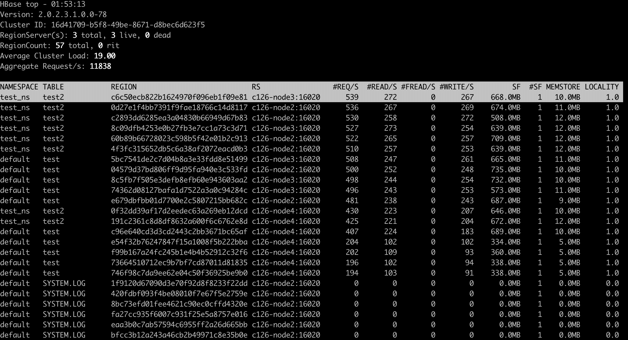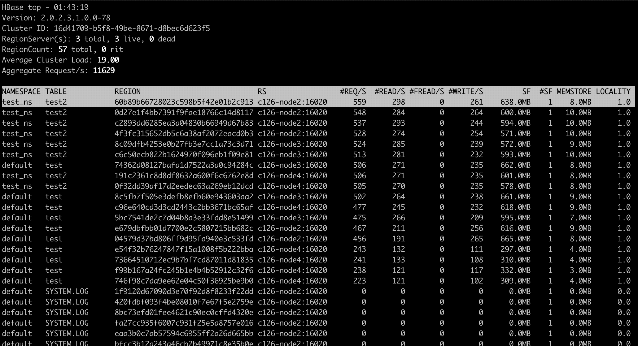 hbtop是针对HBase的实时监视工具,其模仿Unix的_top_命令。 它可以显示摘要信息和每个Region / Namespace / Table / RegionServer的各项指标。 使用此工具,你可以查看按选定字段排序的指标,并且可以过滤仅查看感兴趣的指标。此外,借助向下钻取功能,您可以挖掘热点Region。