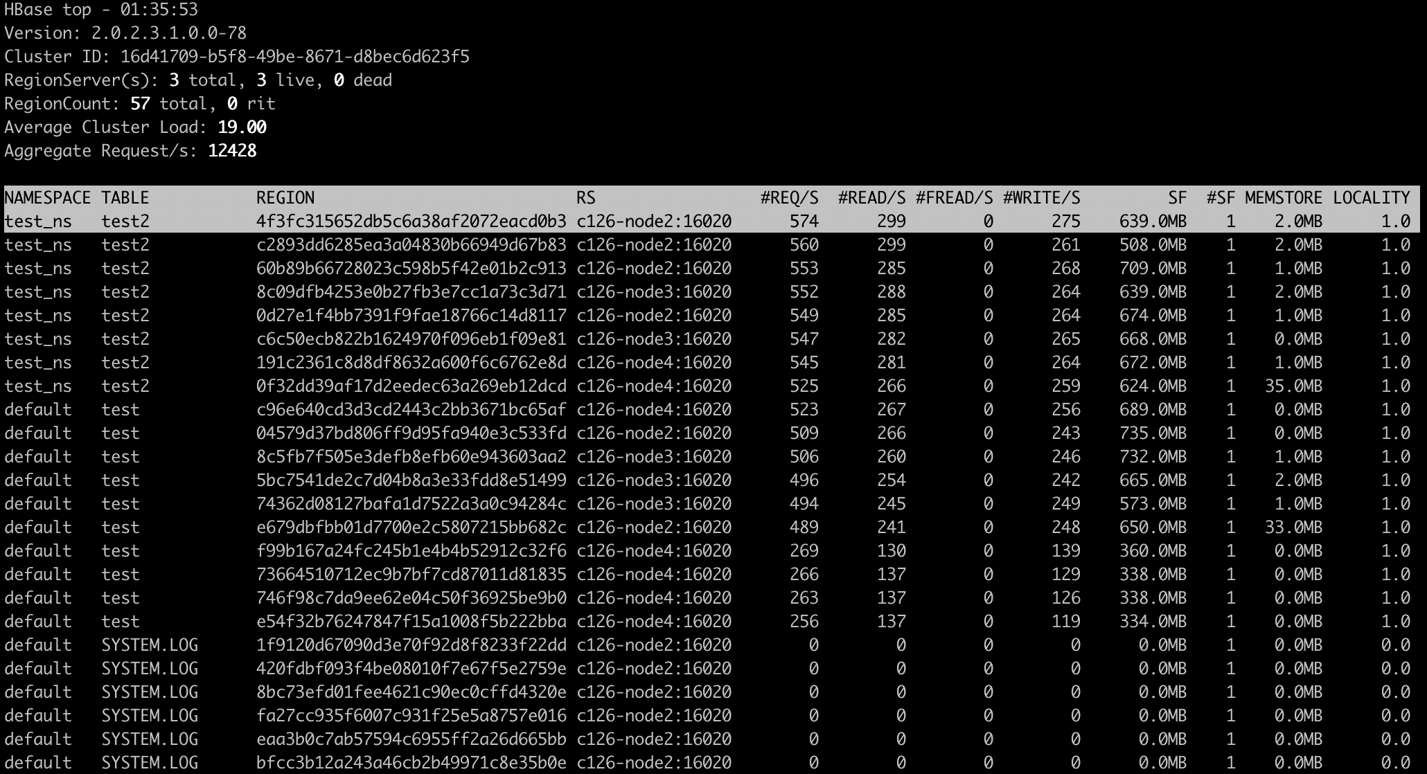 顶部屏幕包含“摘要和指标”部分。 在摘要部分中,您可以查看HBase version,Cluster ID,RegionServer的数量,RegionCount,平均Cluster Load,合计每秒请求数。 在指标部分,您可以查看每个Region / Namespace / Table / RegionServer的指标,具体取决于所选模式。 顶部屏幕会定期刷新-默认情况下为3秒。