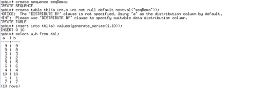sequence是一个存放等差数列的特殊表,该表受DBMS控制。这个表没有实际意义,通常用于为行或者表生成唯一的标识符。创建序列后,在表中使用序列的nextval()函数和generate_series(1,N)函数对表插入数据。