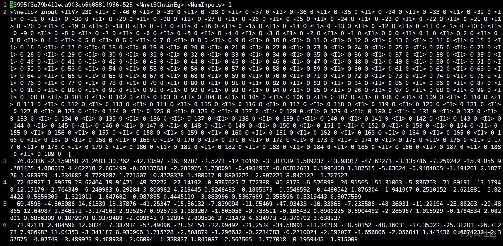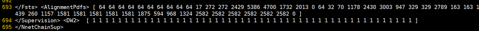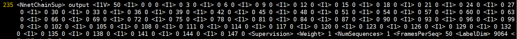 通过以上指令可将chain模型生成的egs由二进制文件转化成文本文件。具体形式如下图所示:
