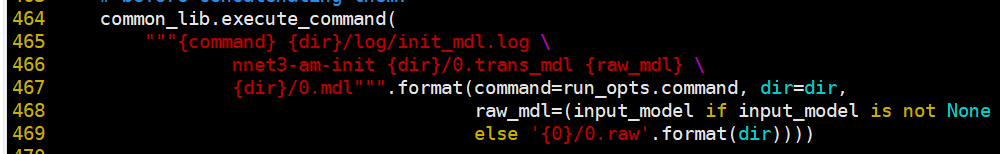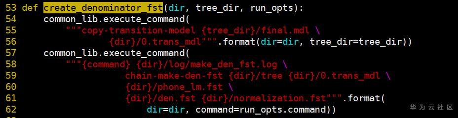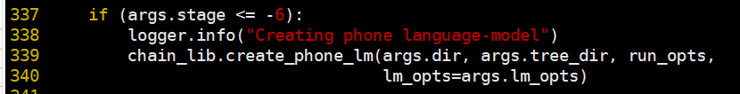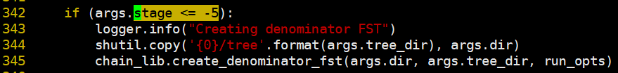 chain模型类似于基于最大互信息的区分性训练,也需要分子和分母有限状态机。在分母有限状态机方面,区别于传统最大互信息的区分性训练,chain模型用训练数据的强制对齐结果,训练了一个四元语法音素单元的语言模型,并将其转成有限状态机。相关代码如下: