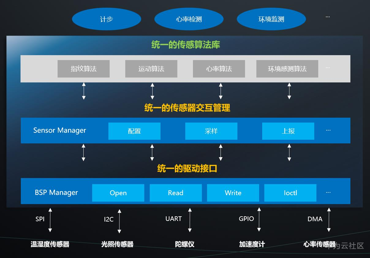 Converged Algorithms:融合算法库(算法基于具体的业务模型),根据具体业务模型,在端侧MCU进行算法融合,例如环境监测算法、计步算法等,从传统、简单采集算法升级到智能算法,应用直接调用,提升传感数据的业务精准度,降低数据采集时延。