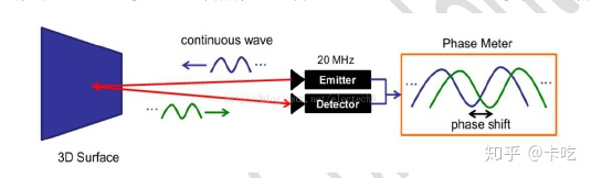 下面图片描述了TOF 相机(连续波)的基本原理,实际应用中,通常采用的是正弦波调制。由于接收端和发射端正弦波的相位偏移和物体距离摄像头的距离成正比,因此可以利用相位偏移来测量距离。