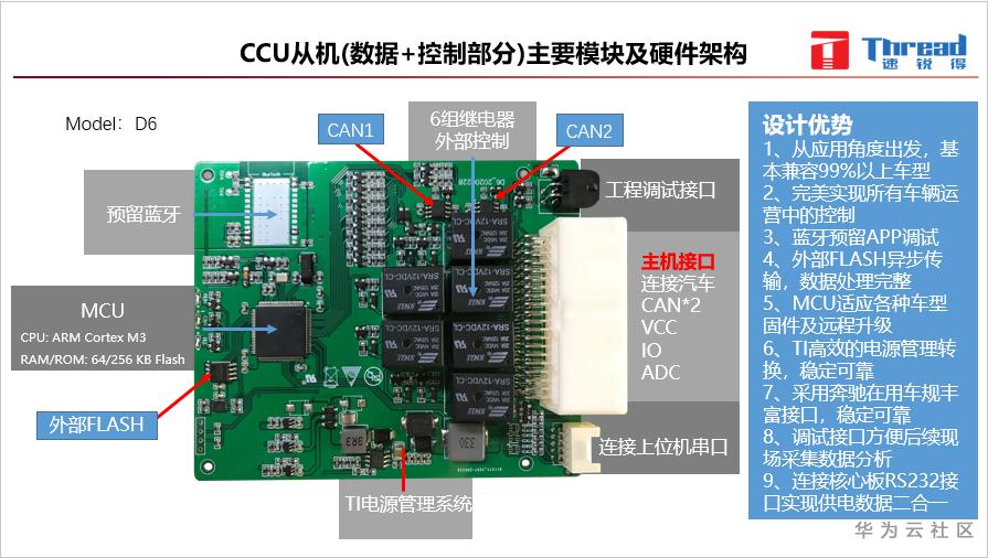 速锐得智能车载监控终端(Model:D6)数据+控制对接上位机从控单元CCU(Cooperative control unit),主要面向网约车、货车、新出行等领域已有车载视频监控终端客户,CCU主要完成汽车CAN总线数据交互和对汽车的门锁、动力、灯光、鸣笛等控制,同时采集汽车总里程、车架号、车速、油量电量、车身BCM状态、ADC信息等,通过TLL串口与车载视频监控终端连接,实现汽车数据和车身远程控制,将汽车底层数据及控制与上位机的交互。