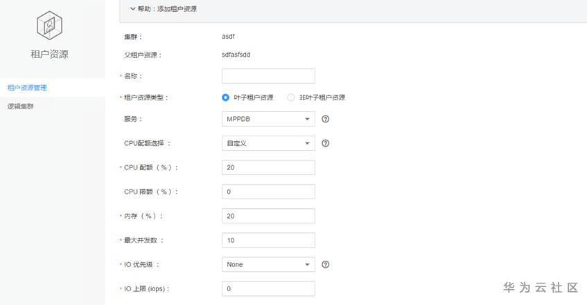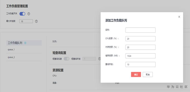 3.选择添加工作负载管理队列,该页面可以设置队列的cpu,内存,存储空间,作业的并发数: