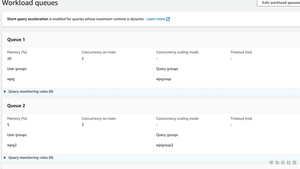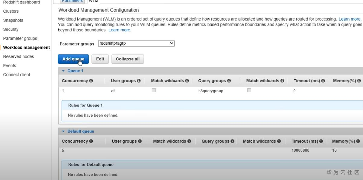 注释:redshift WLM 根据用户组和查询组向队列分配查询,所以需要自己手动创建用户组,查询组并手动将相应的组关联到队列,比较麻烦。