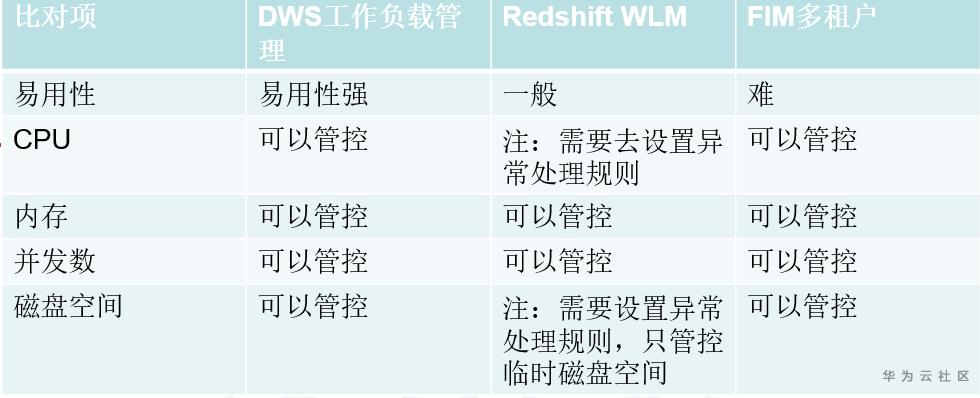 4.cpu的管控:dws的工作负载队列就能设置,比较容易;aws 的管控需要另外设置异常处理规则比较麻烦;