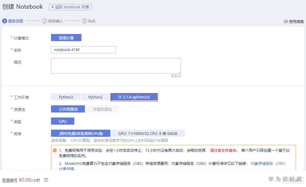 进入Modelarts控制台,新建Notebook,选择配置如下