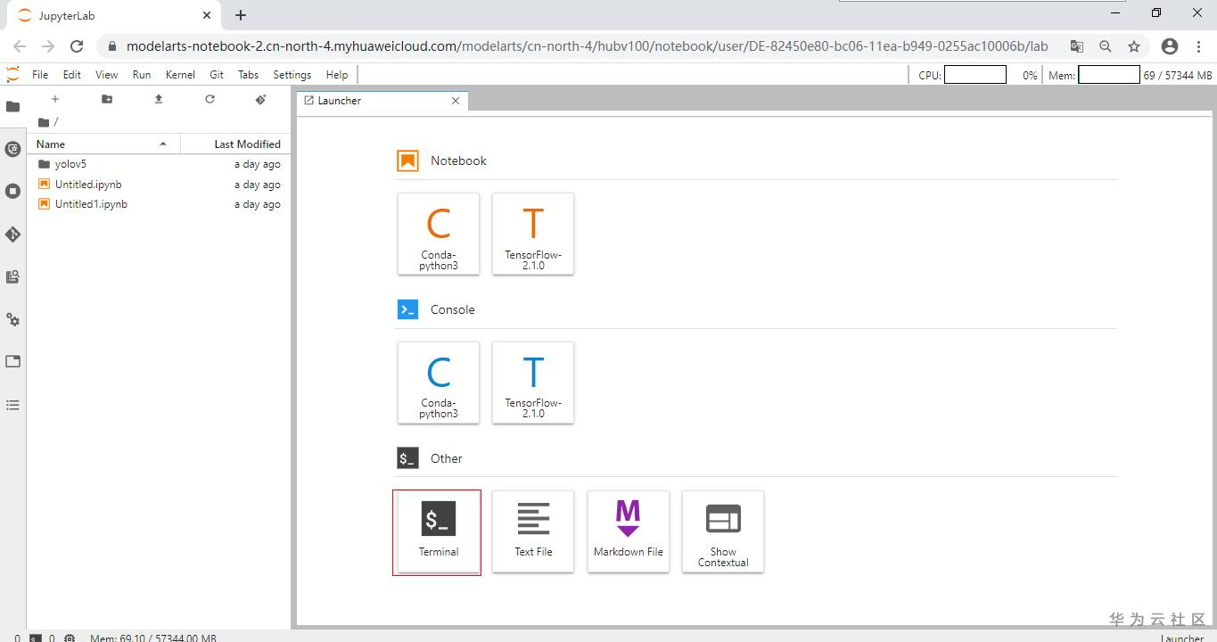 环境启动后进入Lab,jupyterLab官方教程:https://jupyterlab.readthedocs.io/en/stable/,如下图点击Terminal,进入Terminal