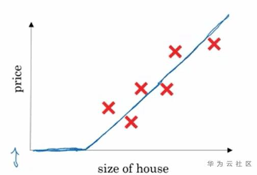我们知道,数学中有线性拟合的概念。意思就是说,根据现有的东西,我画一条线,拟合这些数据,用以预测数据。如下面的例子,房子的大小和价格的关系。现在我有一些房子的大小和价格的部分数据,图上的红叉所示,现在,我需要拟合一条直线,假设拟合的就是图中的蓝线所示。(价格不能为负,只能这样画了)